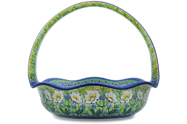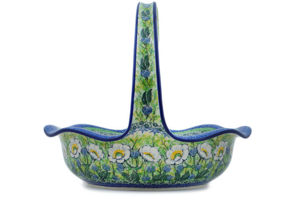 This Angelic Anemones 11" Basket with Handle was handmade and hand decorated in Boleslawiec, Poland by skilled artisans according to old traditional methods. This is a Polish pottery Signature Unikat, which means that it has been hand painted with both sponges and brushes and it is signed by the artist who painted it. Unikat pieces are the most intricate works of art. Larger Unikat items take hours of very careful work to finish. This Polish stoneware is microwave, dishwasher, freezer, and oven safe up to 480°F. It does not contain lead or cadmium. It is part of the Angelic Anemones Collection.