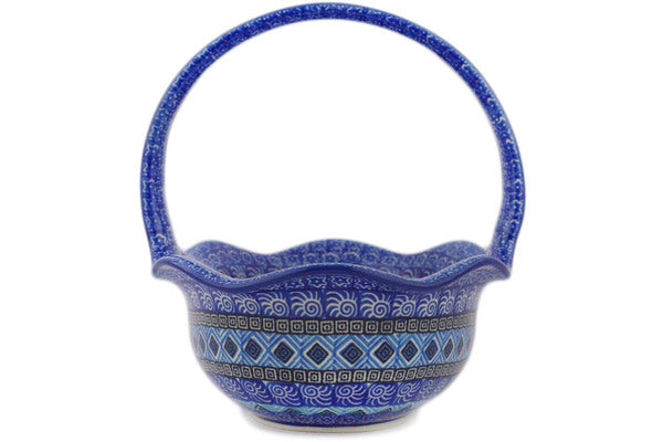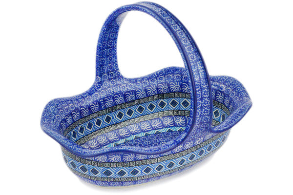 This Aztec Sky 11" Basket with Handle was handmade and hand decorated in Boleslawiec, Poland by skilled artisans according to old traditional methods. This Polish stoneware is microwave, dishwasher, freezer, and oven safe up to 480°F. It does not contain lead or cadmium. It is part of the Aztec Sky Collection.