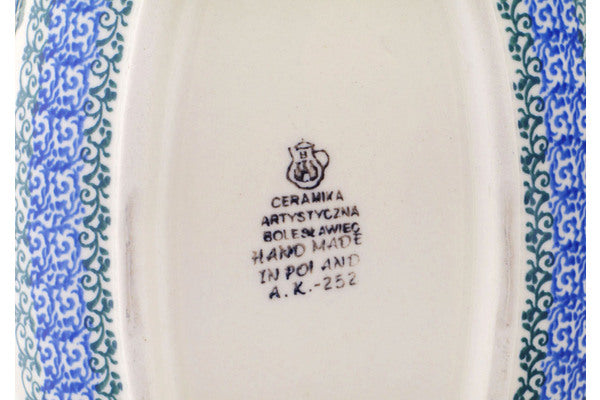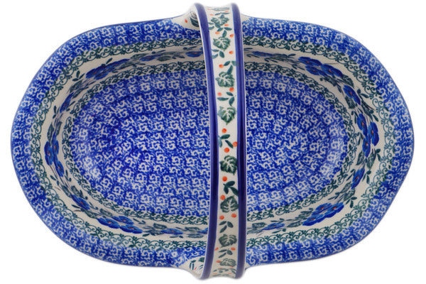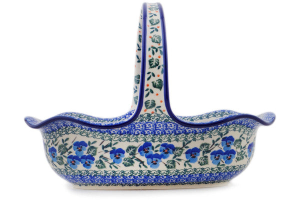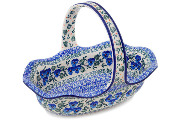 This Blue Pansy 11" Basket with Handle was handmade and hand decorated in Boleslawiec, Poland by skilled artisans according to old traditional methods. This Polish stoneware is microwave, dishwasher, freezer, and oven safe up to 480°F. It does not contain lead or cadmium. It is part of the Blue Pansy Collection.