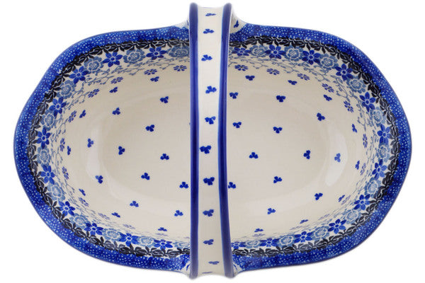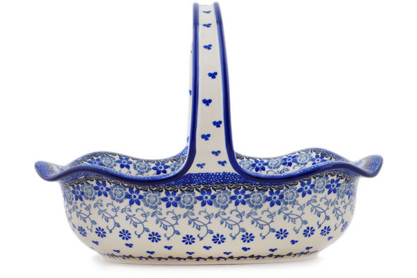 This First Snow 11" Basket with Handle was handmade and hand decorated in Boleslawiec, Poland by skilled artisans according to old traditional methods. This Polish stoneware is microwave, dishwasher, freezer, and oven safe up to 480°F. It does not contain lead or cadmium. It is part of the First Snow Collection.