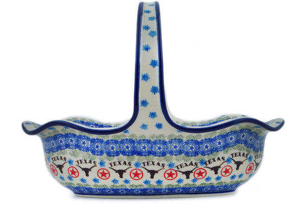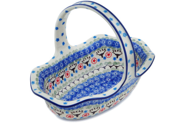 This State Of Texas 11" Basket with Handle was handmade and hand decorated in Boleslawiec, Poland by skilled artisans according to old traditional methods. This Polish stoneware is microwave, dishwasher, freezer, and oven safe up to 480°F. It does not contain lead or cadmium. It is part of the State Of Texas Collection.