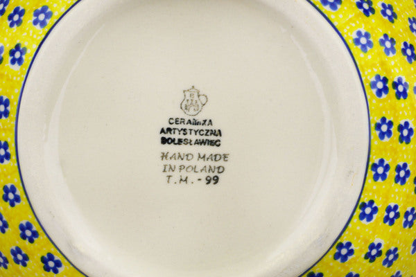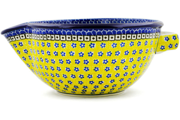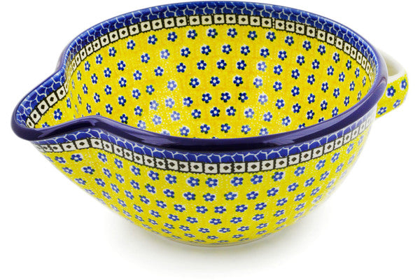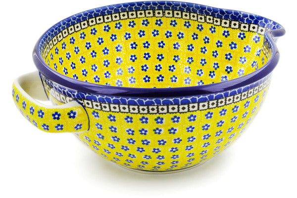 This Sunburst Daisies 12" Batter Bowl was handmade and hand decorated in Boleslawiec, Poland by skilled artisans according to old traditional methods. This Polish stoneware is microwave, dishwasher, freezer, and oven safe up to 480°F. It does not contain lead or cadmium. It is part of the Sunburst Daisies Collection.