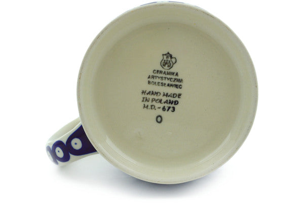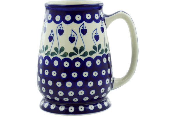 This Bleeding Heart Peacock 34 oz Beer Mug was handmade and hand decorated in Boleslawiec, Poland by skilled artisans according to old traditional methods. This Polish stoneware is microwave, dishwasher, freezer, and oven safe up to 480°F. It does not contain lead or cadmium. It is part of the Bleeding Heart Peacock Collection.