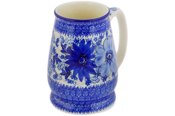 This Blue Wildflower Patch 34 oz Beer Mug was handmade and hand decorated in Boleslawiec, Poland by skilled artisans according to old traditional methods. This is a Polish pottery Signature Unikat, which means that it has been hand painted with both sponges and brushes and it is signed by the artist who painted it. Unikat pieces are the most intricate works of art. Larger Unikat items take hours of very careful work to finish. This Polish stoneware is microwave, dishwasher, freezer, and oven safe up to 480°F. It does not contain lead or cadmium. It is part of the Blue Wildflower Patch Collection.