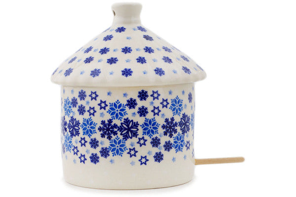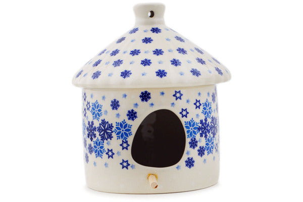 This Snowdrift 7" Birdhouse was handmade and hand decorated in Boleslawiec, Poland by skilled artisans according to old traditional methods. This Polish stoneware is microwave, dishwasher, freezer, and oven safe up to 480°F. It does not contain lead or cadmium. It is part of the Snowdrift Collection.