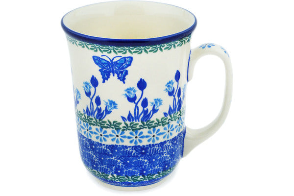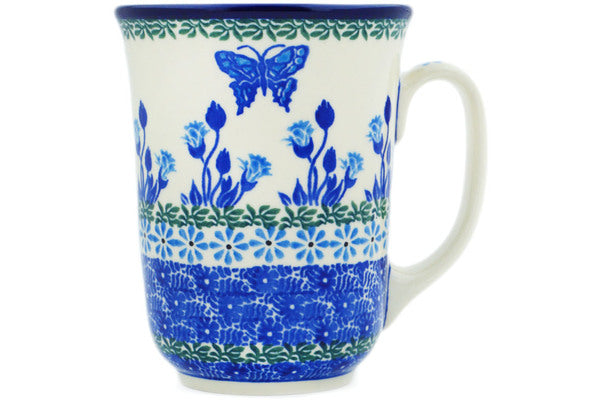 This Blue Butterfly 17 oz Bistro Mug was handmade and hand decorated in Boleslawiec, Poland by skilled artisans according to old traditional methods. This Polish stoneware is microwave, dishwasher, freezer, and oven safe up to 480°F. It does not contain lead or cadmium. It is part of the Blue Butterfly Collection.