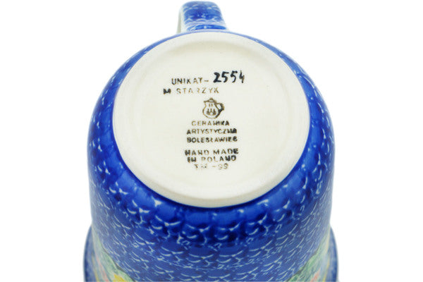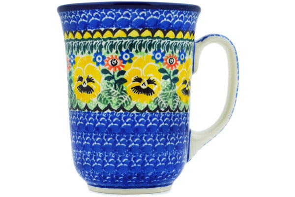 This Pansies Field 17 oz Bistro Mug was handmade and hand decorated in Boleslawiec, Poland by skilled artisans according to old traditional methods. This is a Polish pottery Signature Unikat, which means that it has been hand painted with both sponges and brushes and it is signed by the artist who painted it. Unikat pieces are the most intricate works of art. Larger Unikat items take hours of very careful work to finish. This Polish stoneware is microwave, dishwasher, freezer, and oven safe up to 480°F. It does not contain lead or cadmium. It is part of the Pansies Field Collection.