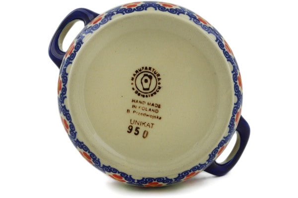 This Red Chains 13 oz Bouillon Cup was handmade and hand decorated in Boleslawiec, Poland by skilled artisans according to old traditional methods. This is a Polish pottery Signature Unikat, which means that it has been hand painted with both sponges and brushes and it is signed by the artist who painted it. Unikat pieces are the most intricate works of art. Larger Unikat items take hours of very careful work to finish. This Polish stoneware is microwave, dishwasher, freezer, and oven safe up to 480°F. It does not contain lead or cadmium. It is part of the Red Chains Collection.