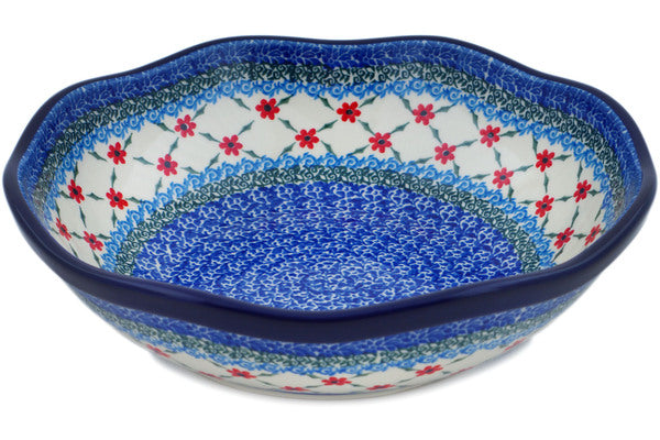 This Daisy Lace 10" Scalloped Bowl was handmade and hand decorated in Boleslawiec, Poland by skilled artisans according to old traditional methods. This Polish stoneware is microwave, dishwasher, freezer, and oven safe up to 480°F. It does not contain lead or cadmium. It is part of the Daisy Lace Collection.