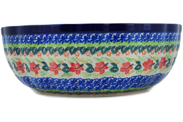 This Dove Escape 11" Fluted Bowl was handmade and hand decorated in Boleslawiec, Poland by skilled artisans according to old traditional methods. This is a Polish pottery Signature Unikat, which means that it has been hand painted with both sponges and brushes and it is signed by the artist who painted it. Unikat pieces are the most intricate works of art. Larger Unikat items take hours of very careful work to finish. This Polish stoneware is microwave, dishwasher, freezer, and oven safe up to 480°F. It does not contain lead or cadmium. It is part of the Dove Escape Collection.