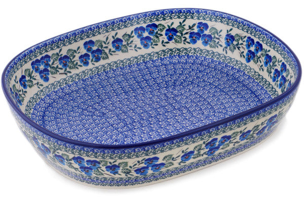 This Blue Pansy 14" Bowl was handmade and hand decorated in Boleslawiec, Poland by skilled artisans according to old traditional methods. This Polish stoneware is microwave, dishwasher, freezer, and oven safe up to 480°F. It does not contain lead or cadmium. It is part of the Blue Pansy Collection.
