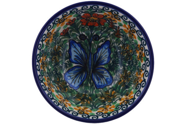 This Butterfly Holly 4" Bowl was handmade and hand decorated in Boleslawiec, Poland by skilled artisans according to old traditional methods. This is a Polish pottery Signature Unikat, which means that it has been hand painted with both sponges and brushes and it is signed by the artist who painted it. Unikat pieces are the most intricate works of art. Larger Unikat items take hours of very careful work to finish. This Polish stoneware is microwave, dishwasher, freezer, and oven safe up to 480°F. It does not contain lead or cadmium. It is part of the Butterfly Holly Collection.