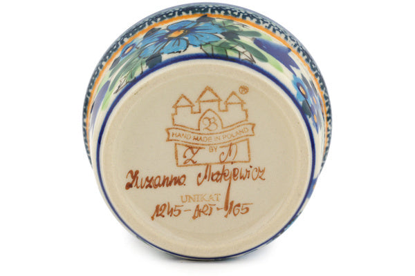 This Evangeline 4" Bowl was handmade and hand decorated in Boleslawiec, Poland by skilled artisans according to old traditional methods. This is a Polish pottery Signature Unikat, which means that it has been hand painted with both sponges and brushes and it is signed by the artist who painted it. Unikat pieces are the most intricate works of art. Larger Unikat items take hours of very careful work to finish. This Polish stoneware is microwave, dishwasher, freezer, and oven safe up to 480°F. It does not contain lead or cadmium. It is part of the Evangeline Collection.
