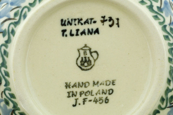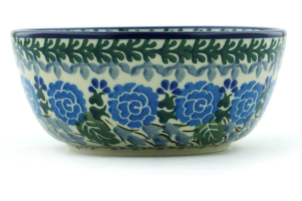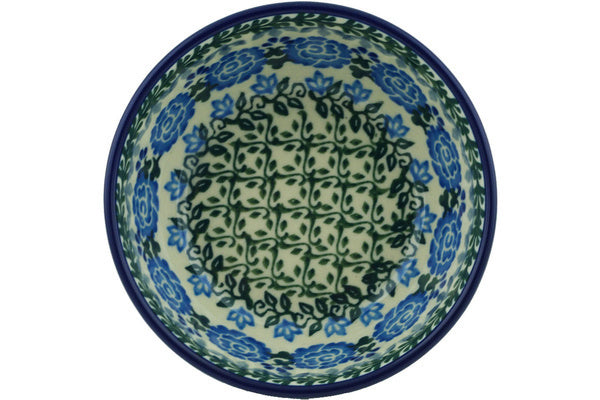 This Blue Rose Trellis 5" Bowl was handmade and hand decorated in Boleslawiec, Poland by skilled artisans according to old traditional methods. This is a Polish pottery Signature Unikat, which means that it has been hand painted with both sponges and brushes and it is signed by the artist who painted it. Unikat pieces are the most intricate works of art. Larger Unikat items take hours of very careful work to finish. This Polish stoneware is microwave, dishwasher, freezer, and oven safe up to 480°F. It does not contain lead or cadmium. It is part of the Blue Rose Trellis Collection.