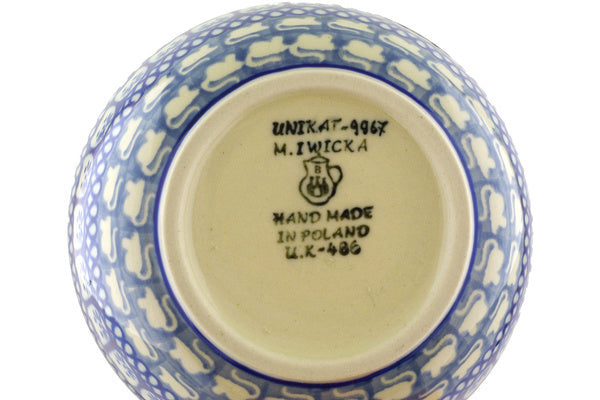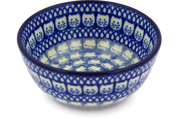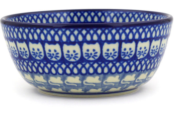 This Cat And Mouse Brigade 5" Bowl was handmade and hand decorated in Boleslawiec, Poland by skilled artisans according to old traditional methods. This is a Polish pottery Signature Unikat, which means that it has been hand painted with both sponges and brushes and it is signed by the artist who painted it. Unikat pieces are the most intricate works of art. Larger Unikat items take hours of very careful work to finish. This Polish stoneware is microwave, dishwasher, freezer, and oven safe up to 480°F. It does not contain lead or cadmium. It is part of the Cat And Mouse Brigade Collection.