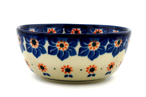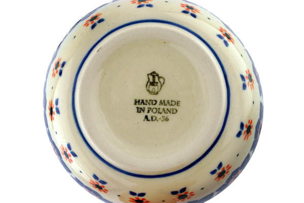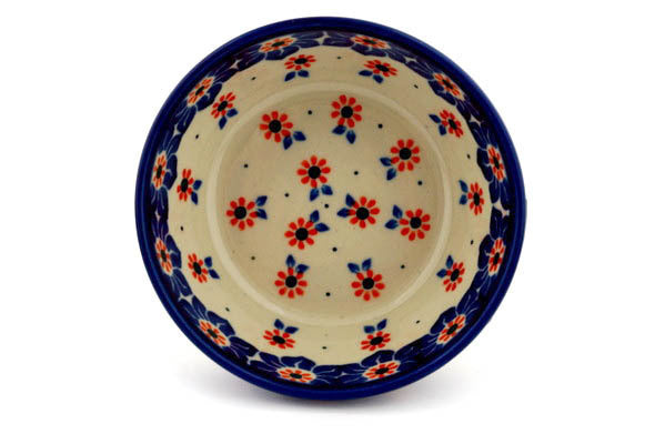 This Daisy Ribbons 5" Bowl was handmade and hand decorated in Boleslawiec, Poland by skilled artisans according to old traditional methods. This Polish stoneware is microwave, dishwasher, freezer, and oven safe up to 480°F. It does not contain lead or cadmium. It is part of the Daisy Ribbons Collection.