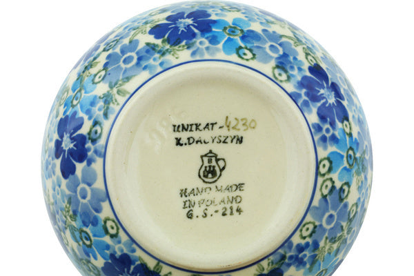 This Fields Of Blue 5" Bowl was handmade and hand decorated in Boleslawiec, Poland by skilled artisans according to old traditional methods. This is a Polish pottery Signature Unikat, which means that it has been hand painted with both sponges and brushes and it is signed by the artist who painted it. Unikat pieces are the most intricate works of art. Larger Unikat items take hours of very careful work to finish. This Polish stoneware is microwave, dishwasher, freezer, and oven safe up to 480°F. It does not contain lead or cadmium. It is part of the Fields Of Blue Collection.
