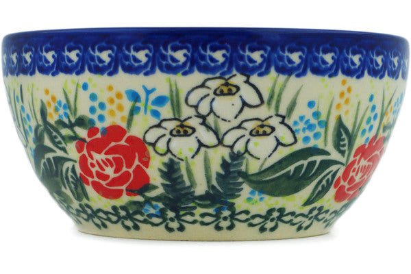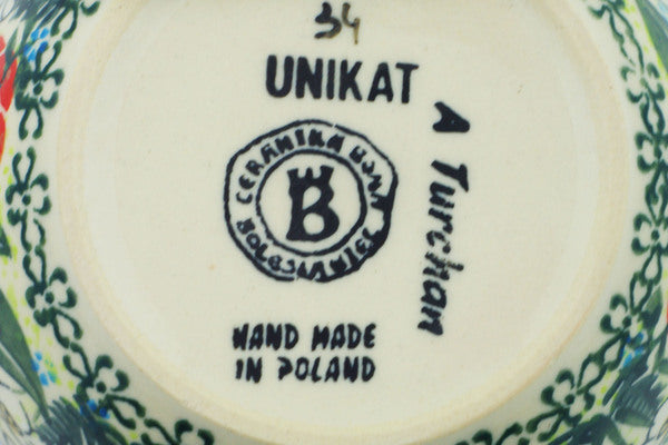 This Fresh Happiness 5" Bowl was handmade and hand decorated in Boleslawiec, Poland by skilled artisans according to old traditional methods. This is a Polish pottery Signature Unikat, which means that it has been hand painted with both sponges and brushes and it is signed by the artist who painted it. Unikat pieces are the most intricate works of art. Larger Unikat items take hours of very careful work to finish. This Polish stoneware is microwave, dishwasher, freezer, and oven safe up to 480°F. It does not contain lead or cadmium. It is part of the Fresh Happiness Collection.