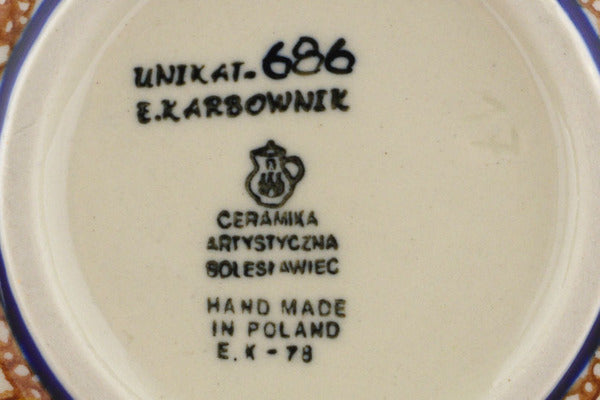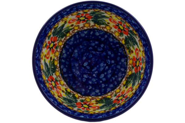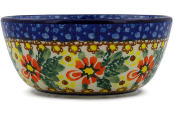 This Hidden Sunflower 5" Bowl was handmade and hand decorated in Boleslawiec, Poland by skilled artisans according to old traditional methods. This is a Polish pottery Signature Unikat, which means that it has been hand painted with both sponges and brushes and it is signed by the artist who painted it. Unikat pieces are the most intricate works of art. Larger Unikat items take hours of very careful work to finish. This Polish stoneware is microwave, dishwasher, freezer, and oven safe up to 480°F. It does not contain lead or cadmium. It is part of the Hidden Sunflower Collection.