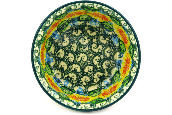 This Marigold Chain 5" Bowl was handmade and hand decorated in Boleslawiec, Poland by skilled artisans according to old traditional methods. This is a Polish pottery Signature Unikat, which means that it has been hand painted with both sponges and brushes and it is signed by the artist who painted it. Unikat pieces are the most intricate works of art. Larger Unikat items take hours of very careful work to finish. This Polish stoneware is microwave, dishwasher, freezer, and oven safe up to 480°F. It does not contain lead or cadmium. It is part of the Marigold Chain Collection.