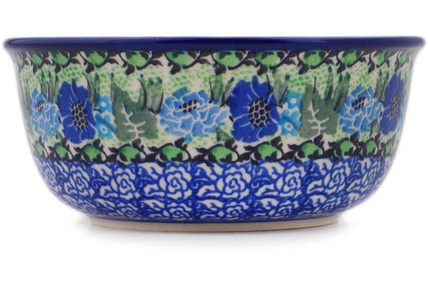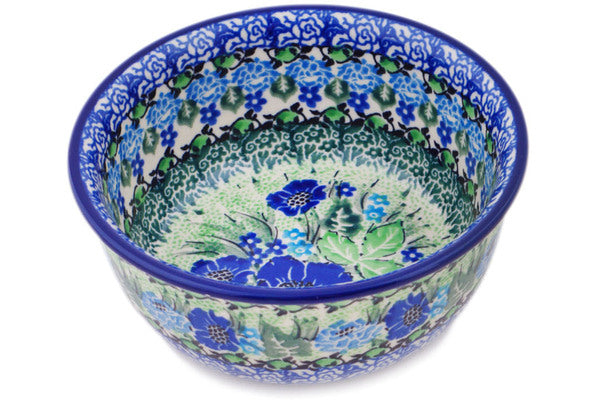 This Moody Blues 5" Bowl was handmade and hand decorated in Boleslawiec, Poland by skilled artisans according to old traditional methods. This is a Polish pottery Signature Unikat, which means that it has been hand painted with both sponges and brushes and it is signed by the artist who painted it. Unikat pieces are the most intricate works of art. Larger Unikat items take hours of very careful work to finish. This Polish stoneware is microwave, dishwasher, freezer, and oven safe up to 480°F. It does not contain lead or cadmium. It is part of the Moody Blues Collection.