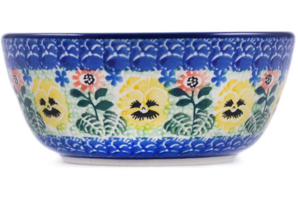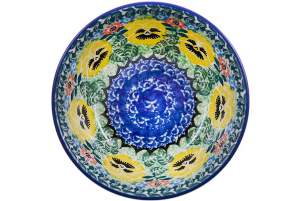 This Pansies Field 5" Bowl was handmade and hand decorated in Boleslawiec, Poland by skilled artisans according to old traditional methods. This is a Polish pottery Signature Unikat, which means that it has been hand painted with both sponges and brushes and it is signed by the artist who painted it. Unikat pieces are the most intricate works of art. Larger Unikat items take hours of very careful work to finish. This Polish stoneware is microwave, dishwasher, freezer, and oven safe up to 480°F. It does not contain lead or cadmium. It is part of the Pansies Field Collection.