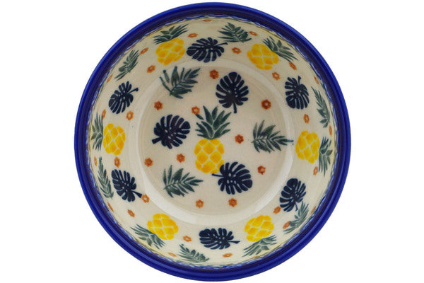 This Pineapple Parade 5" Bowl was handmade and hand decorated in Boleslawiec, Poland by skilled artisans according to old traditional methods. This Polish stoneware is microwave, dishwasher, freezer, and oven safe up to 480°F. It does not contain lead or cadmium. It is part of the Pineapple Parade Collection.