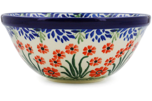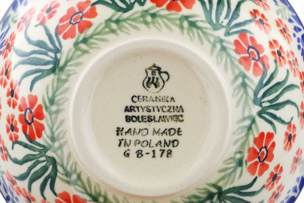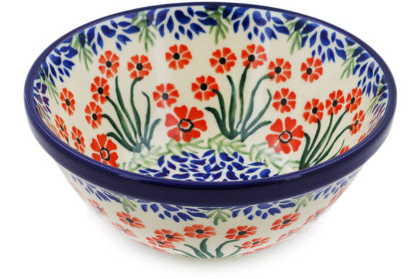 This Red April Showers 5" Bowl was handmade and hand decorated in Boleslawiec, Poland by skilled artisans according to old traditional methods. This Polish stoneware is microwave, dishwasher, freezer, and oven safe up to 480°F. It does not contain lead or cadmium. It is part of the Red April Showers Collection.