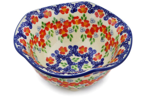 This Red Chains 5" Bowl was handmade and hand decorated in Boleslawiec, Poland by skilled artisans according to old traditional methods. This is a Polish pottery Signature Unikat, which means that it has been hand painted with both sponges and brushes and it is signed by the artist who painted it. Unikat pieces are the most intricate works of art. Larger Unikat items take hours of very careful work to finish. This Polish stoneware is microwave, dishwasher, freezer, and oven safe up to 480°F. It does not contain lead or cadmium. It is part of the Red Chains Collection.