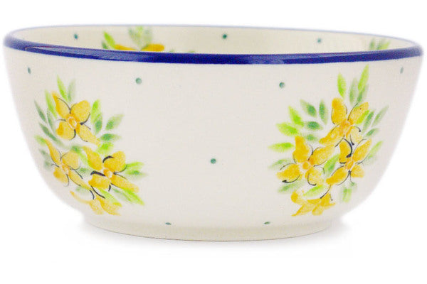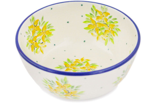 This Vanilla Blossom 5" Bowl was handmade and hand decorated in Boleslawiec, Poland by skilled artisans according to old traditional methods. This Polish stoneware is microwave, dishwasher, freezer, and oven safe up to 480°F. It does not contain lead or cadmium. It is part of the Vanilla Blossom Collection.