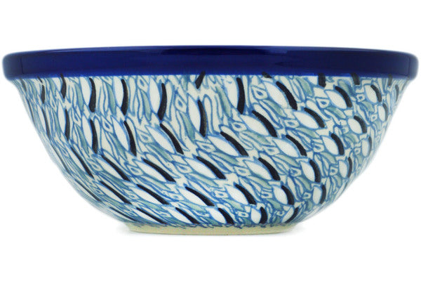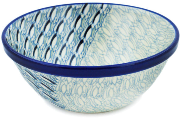 This Blue Wave 6" Bowl was handmade and hand decorated in Boleslawiec, Poland by skilled artisans according to old traditional methods. This is a Polish pottery Signature Unikat, which means that it has been hand painted with both sponges and brushes and it is signed by the artist who painted it. Unikat pieces are the most intricate works of art. Larger Unikat items take hours of very careful work to finish. This Polish stoneware is microwave, dishwasher, freezer, and oven safe up to 480°F. It does not contain lead or cadmium. It is part of the Blue Wave Collection.