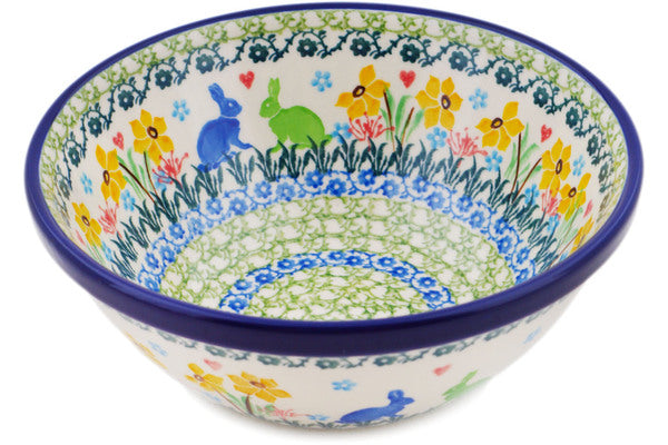 This Hopping In Love 6" Bowl was handmade and hand decorated in Boleslawiec, Poland by skilled artisans according to old traditional methods. This Polish stoneware is microwave, dishwasher, freezer, and oven safe up to 480°F. It does not contain lead or cadmium. It is part of the Hopping In Love Collection.