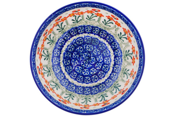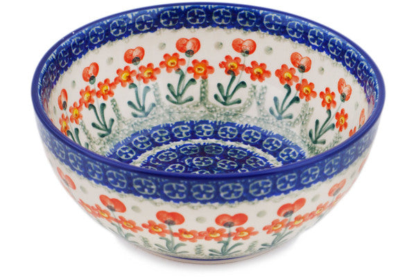 This Peach Spring Daisy 6" Bowl was handmade and hand decorated in Boleslawiec, Poland by skilled artisans according to old traditional methods. This Polish stoneware is microwave, dishwasher, freezer, and oven safe up to 480°F. It does not contain lead or cadmium. It is part of the Peach Spring Daisy Collection.