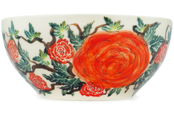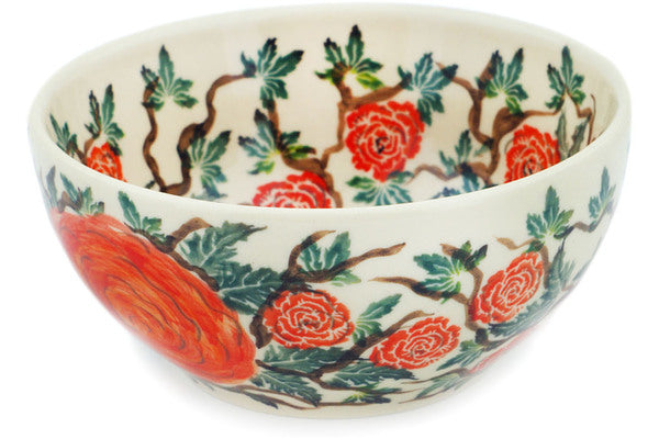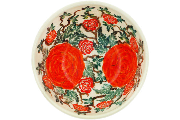This Thornless Beauty 6" Bowl was handmade and hand decorated in Boleslawiec, Poland by skilled artisans according to old traditional methods. This is a Polish pottery Signature Unikat, which means that it has been hand painted with both sponges and brushes and it is signed by the artist who painted it. Unikat pieces are the most intricate works of art. Larger Unikat items take hours of very careful work to finish. This Polish stoneware is microwave, dishwasher, freezer, and oven safe up to 480°F. It does not contain lead or cadmium. It is part of the Thornless Beauty Collection.
