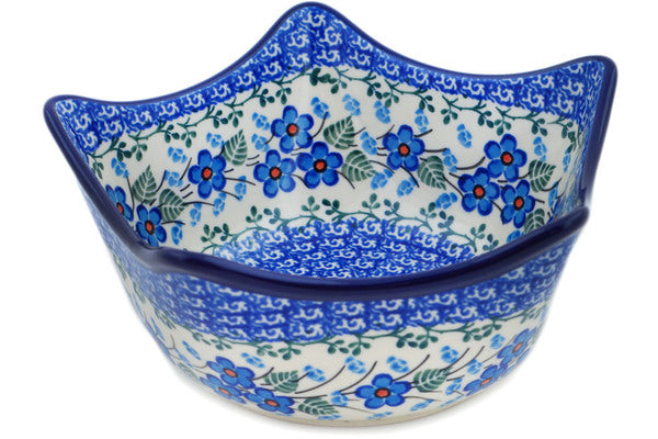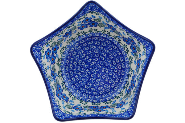 This Blue Blossom 7" Star Shaped Bowl was handmade and hand decorated in Boleslawiec, Poland by skilled artisans according to old traditional methods. This Polish stoneware is microwave, dishwasher, freezer, and oven safe up to 480°F. It does not contain lead or cadmium. It is part of the Blue Blossom Collection.