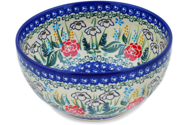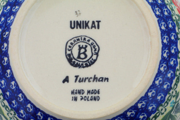 This Fresh Happiness 7" Bowl was handmade and hand decorated in Boleslawiec, Poland by skilled artisans according to old traditional methods. This is a Polish pottery Signature Unikat, which means that it has been hand painted with both sponges and brushes and it is signed by the artist who painted it. Unikat pieces are the most intricate works of art. Larger Unikat items take hours of very careful work to finish. This Polish stoneware is microwave, dishwasher, freezer, and oven safe up to 480°F. It does not contain lead or cadmium. It is part of the Fresh Happiness Collection.