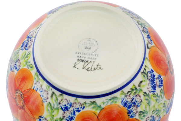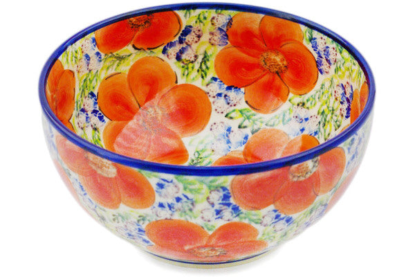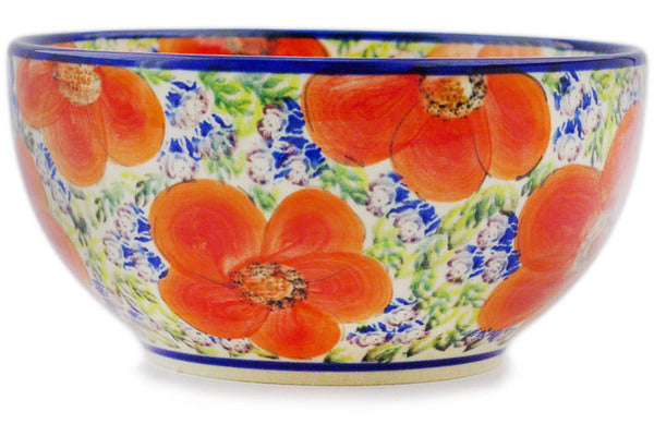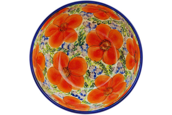 This Sunrise Petals 7" Bowl was handmade and hand decorated in Boleslawiec, Poland by skilled artisans according to old traditional methods. This is a Polish pottery Signature Unikat, which means that it has been hand painted with both sponges and brushes and it is signed by the artist who painted it. Unikat pieces are the most intricate works of art. Larger Unikat items take hours of very careful work to finish. This Polish stoneware is microwave, dishwasher, freezer, and oven safe up to 480°F. It does not contain lead or cadmium. It is part of the Sunrise Petals Collection.