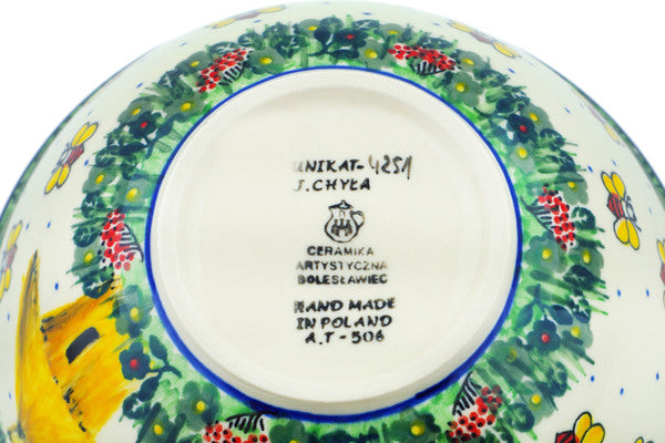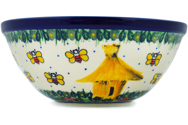 This Bee Happy 8" Bowl was handmade and hand decorated in Boleslawiec, Poland by skilled artisans according to old traditional methods. This is a Polish pottery Signature Unikat, which means that it has been hand painted with both sponges and brushes and it is signed by the artist who painted it. Unikat pieces are the most intricate works of art. Larger Unikat items take hours of very careful work to finish. This Polish stoneware is microwave, dishwasher, freezer, and oven safe up to 480°F. It does not contain lead or cadmium. It is part of the Bee Happy Collection.