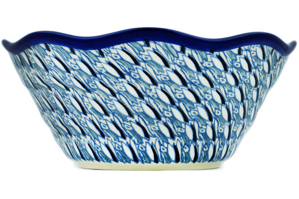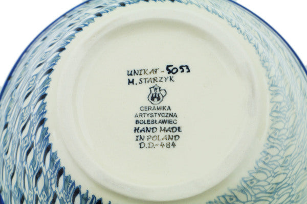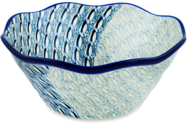 This Blue Wave 8" Scalloped Bowl was handmade and hand decorated in Boleslawiec, Poland by skilled artisans according to old traditional methods. This is a Polish pottery Signature Unikat, which means that it has been hand painted with both sponges and brushes and it is signed by the artist who painted it. Unikat pieces are the most intricate works of art. Larger Unikat items take hours of very careful work to finish. This Polish stoneware is microwave, dishwasher, freezer, and oven safe up to 480°F. It does not contain lead or cadmium. It is part of the Blue Wave Collection.