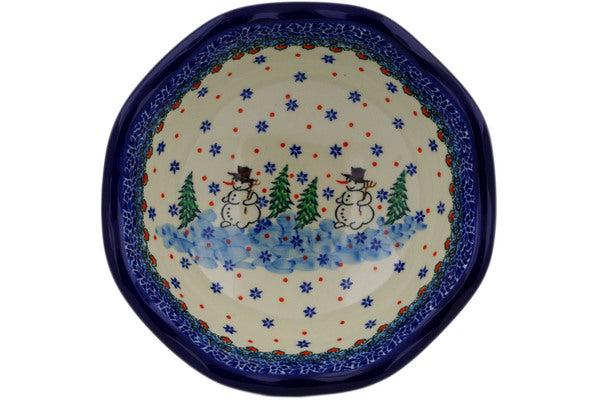 This Dancing Snowman 8" Bowl with Pedestal was handmade and hand decorated in Boleslawiec, Poland by skilled artisans according to old traditional methods. This is a Polish pottery Signature Unikat, which means that it has been hand painted with both sponges and brushes and it is signed by the artist who painted it. Unikat pieces are the most intricate works of art. Larger Unikat items take hours of very careful work to finish. This Polish stoneware is microwave, dishwasher, freezer, and oven safe up to 480°F. It does not contain lead or cadmium. It is part of the Dancing Snowman Collection.