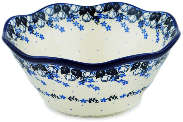 This Flowers At Dusk 8" Scalloped Bowl was handmade and hand decorated in Boleslawiec, Poland by skilled artisans according to old traditional methods. This Polish stoneware is microwave, dishwasher, freezer, and oven safe up to 480°F. It does not contain lead or cadmium. It is part of the Flowers At Dusk Collection.
