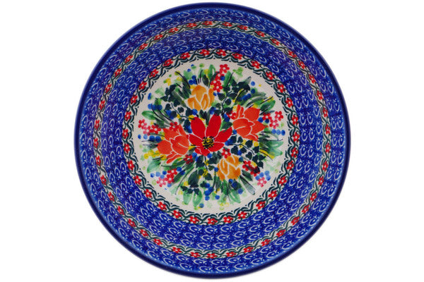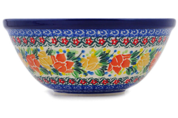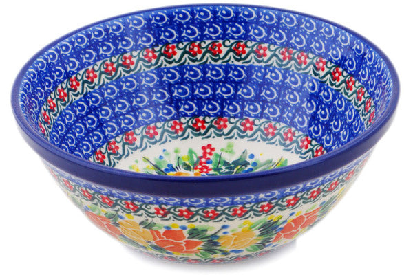 This Red And Yellow Flowers 8" Bowl was handmade and hand decorated in Boleslawiec, Poland by skilled artisans according to old traditional methods. This is a Polish pottery Signature Unikat, which means that it has been hand painted with both sponges and brushes and it is signed by the artist who painted it. Unikat pieces are the most intricate works of art. Larger Unikat items take hours of very careful work to finish. This Polish stoneware is microwave, dishwasher, freezer, and oven safe up to 480°F. It does not contain lead or cadmium. It is part of the Red And Yellow Flowers Collection.