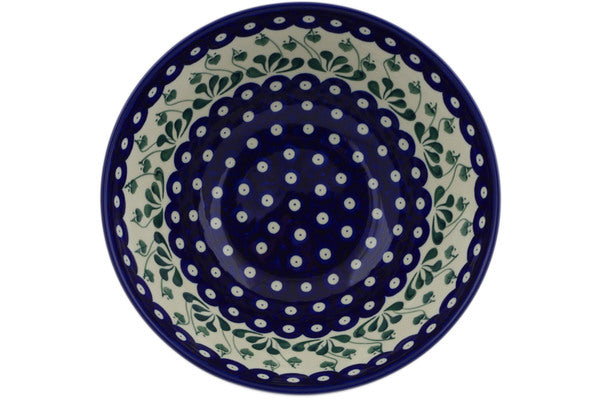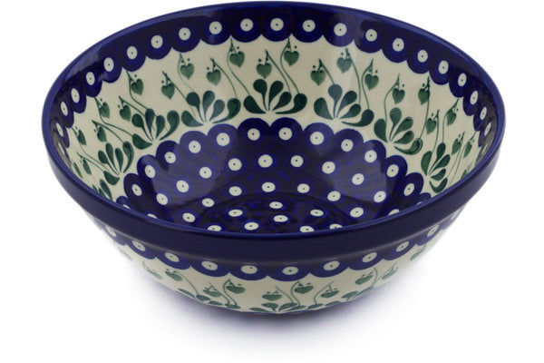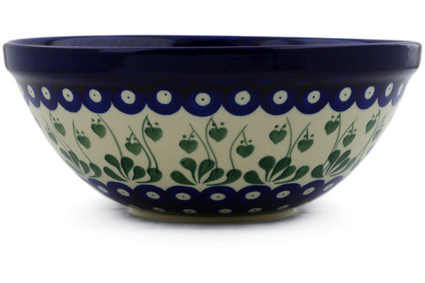 This Bleeding Heart Peacock 9" Bowl was handmade and hand decorated in Boleslawiec, Poland by skilled artisans according to old traditional methods. This Polish stoneware is microwave, dishwasher, freezer, and oven safe up to 480°F. It does not contain lead or cadmium. It is part of the Bleeding Heart Peacock Collection.