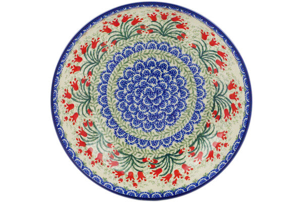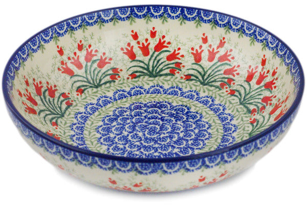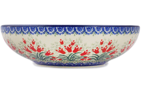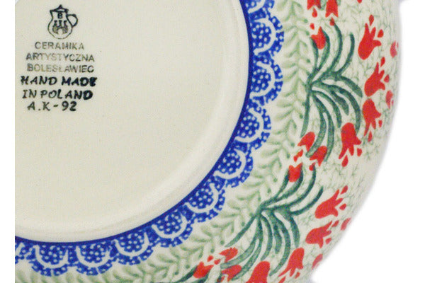 This Crimson Bells 9" Bowl was handmade and hand decorated in Boleslawiec, Poland by skilled artisans according to old traditional methods. This Polish stoneware is microwave, dishwasher, freezer, and oven safe up to 480°F. It does not contain lead or cadmium. It is part of the Crimson Bells Collection.