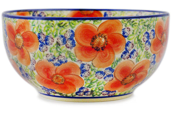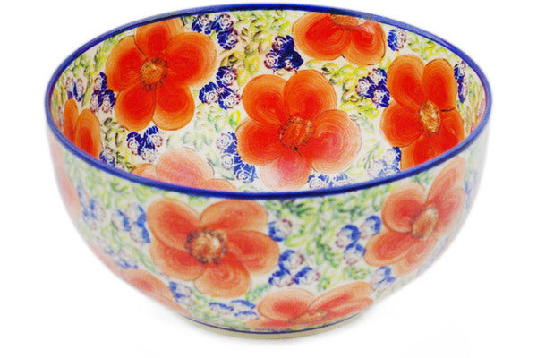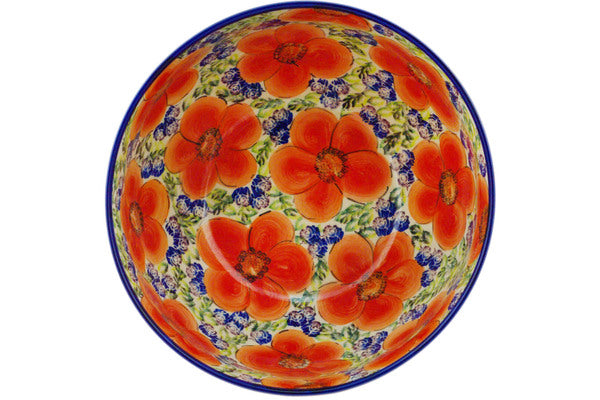 This Sunrise Petals 9" Bowl was handmade and hand decorated in Boleslawiec, Poland by skilled artisans according to old traditional methods. This is a Polish pottery Signature Unikat, which means that it has been hand painted with both sponges and brushes and it is signed by the artist who painted it. Unikat pieces are the most intricate works of art. Larger Unikat items take hours of very careful work to finish. This Polish stoneware is microwave, dishwasher, freezer, and oven safe up to 480°F. It does not contain lead or cadmium. It is part of the Sunrise Petals Collection.