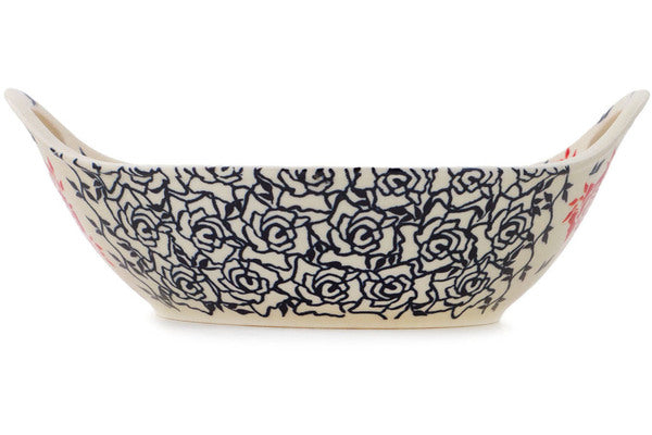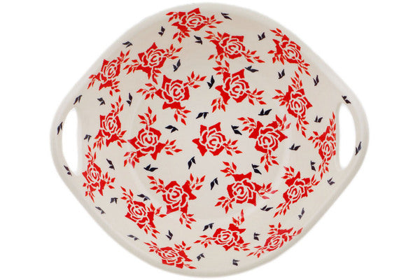This Together Forever 10" Bowl with Handles was handmade and hand decorated in Boleslawiec, Poland by skilled artisans according to old traditional methods. This Polish stoneware is microwave, dishwasher, freezer, and oven safe up to 480°F. It does not contain lead or cadmium. It is part of the Together Forever Collection.