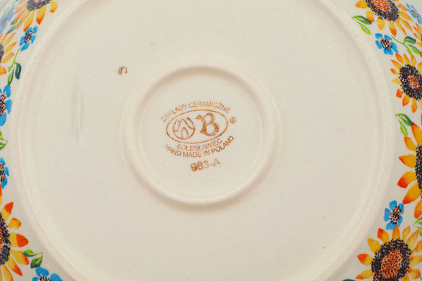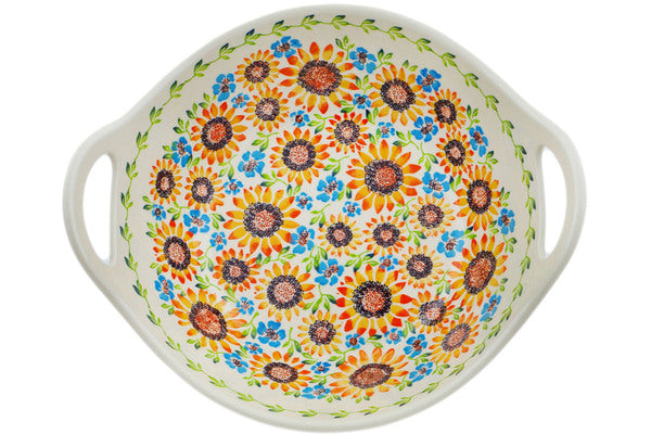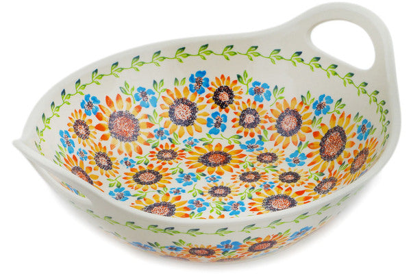 This Orange Sunflower Garden 12-inch Bowl with Handles was handmade and hand decorated in Boleslawiec, Poland by skilled artisans according to old traditional methods. This Polish stoneware is microwave, dishwasher, freezer, and oven safe up to 480°F. It does not contain lead or cadmium. It is part of the Orange Sunflower Garden Collection.