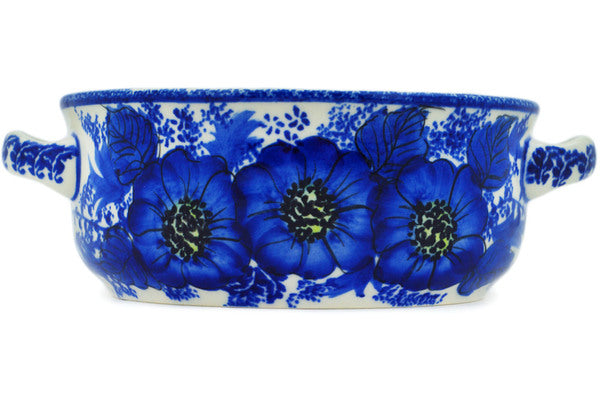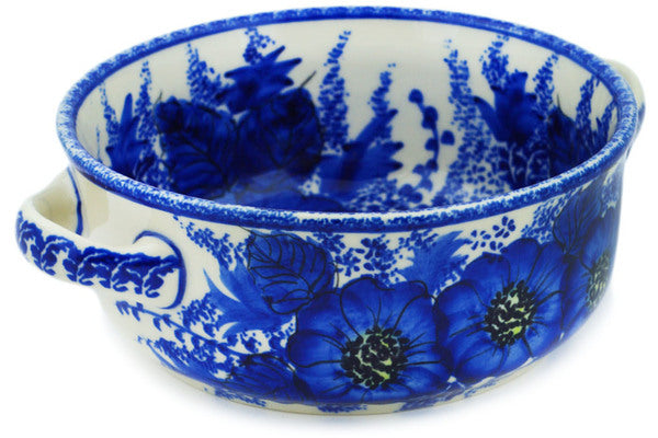 This Blue Poppy Dream 8" Round Baker with Handles was handmade and hand decorated in Boleslawiec, Poland by skilled artisans according to old traditional methods. This is a Polish pottery Signature Unikat, which means that it has been hand painted with both sponges and brushes and it is signed by the artist who painted it. Unikat pieces are the most intricate works of art. Larger Unikat items take hours of very careful work to finish. This Polish stoneware is microwave, dishwasher, freezer, and oven safe up to 480°F. It does not contain lead or cadmium. It is part of the Blue Poppy Dream Collection.