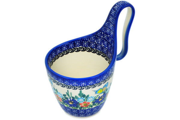 This Butterfly Flower Bed 7" Bowl with Loop-Handle was handmade and hand decorated in Boleslawiec, Poland by skilled artisans according to old traditional methods. This is a Polish pottery Signature Unikat, which means that it has been hand painted with both sponges and brushes and it is signed by the artist who painted it. Unikat pieces are the most intricate works of art. Larger Unikat items take hours of very careful work to finish. This Polish stoneware is microwave, dishwasher, freezer, and oven safe up to 480°F. It does not contain lead or cadmium. It is part of the Butterfly Flower Bed Collection.