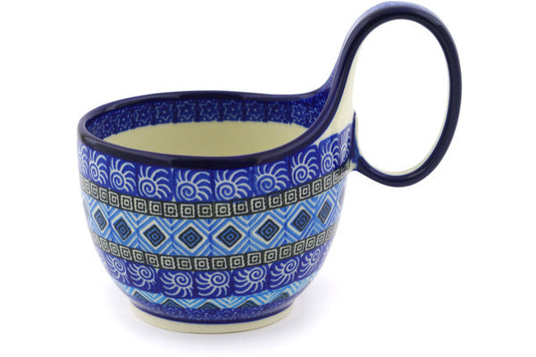This Aztec Sky 16 oz Bowl with Loop-Handle was handmade and hand decorated in Boleslawiec, Poland by skilled artisans according to old traditional methods. This Polish stoneware is microwave, dishwasher, freezer, and oven safe up to 480°F. It does not contain lead or cadmium. It is part of the Aztec Sky Collection.